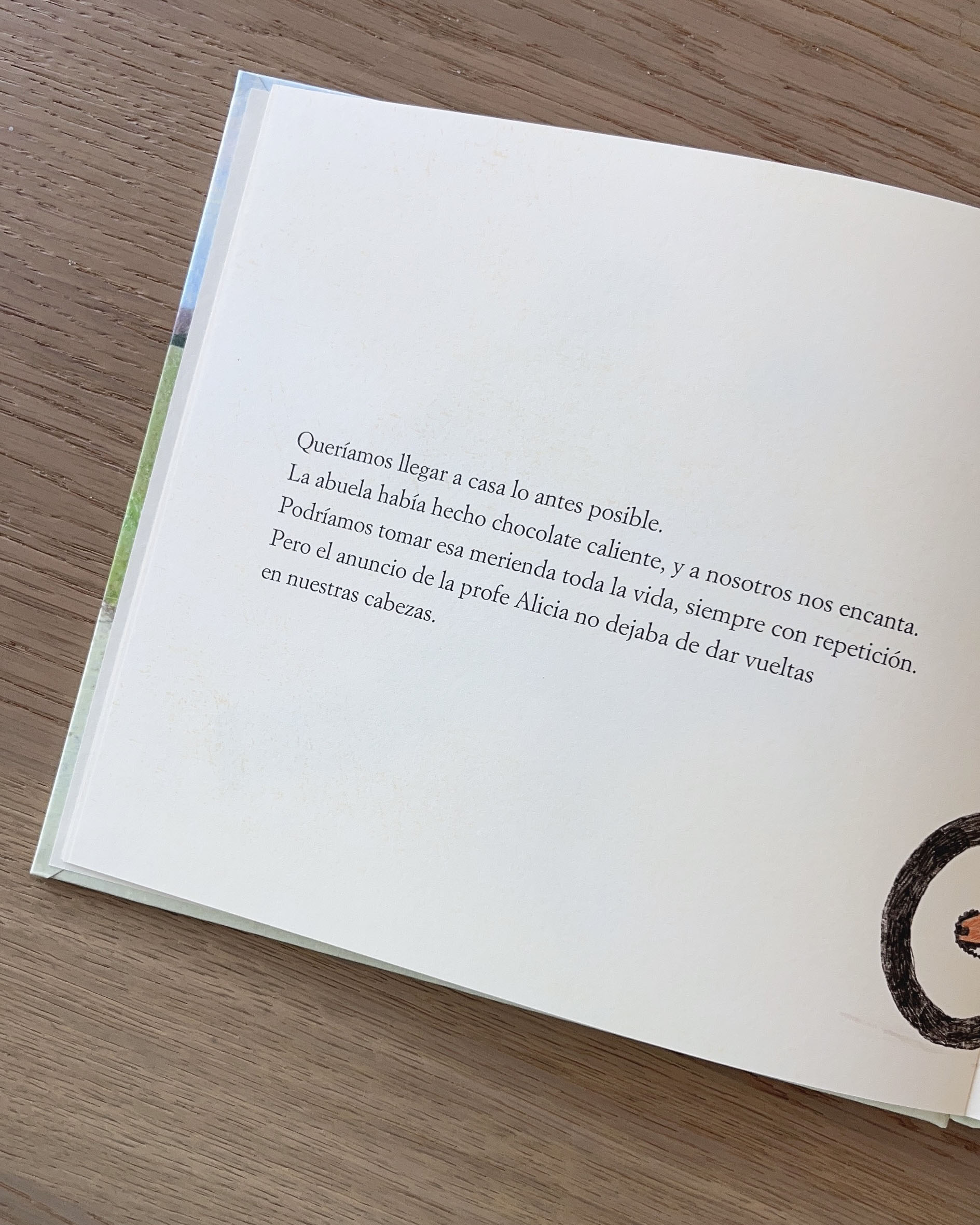 El anuncio de la maestra sobre la incorporación de dos migrantes no frena el deseo de los protagonistas de llegar pronto a casa para disfrutar de su merienda favorita. Es entonces cuando empiezan a intercambiar hipótesis sobre el significado de aquella misteriosa palabra. Desde el desconocimiento, la inocencia y la curiosidad, estos dos hermanos plantean ideas entre lo lúdico, lo comestible y lo doméstico, desarrollando argumentos basados en la lógica infantil que suscitan gracia y ternura. Pero, como una metáfora de la sociedad actual que rechaza la población migrante, la ignorancia deriva en desconfianza, del interés inicial pasan al miedo y los pensamientos negativos hacen mella en la mente de los niños. Al día siguiente, en su regreso al aula —acaso el absentismo no es casual, sino la reacción de las familias al contacto con los recién llegados— se encuentran a dos nuevos compañeros llegados desde un país lejano y con los que enseguida traban una gran amistad.