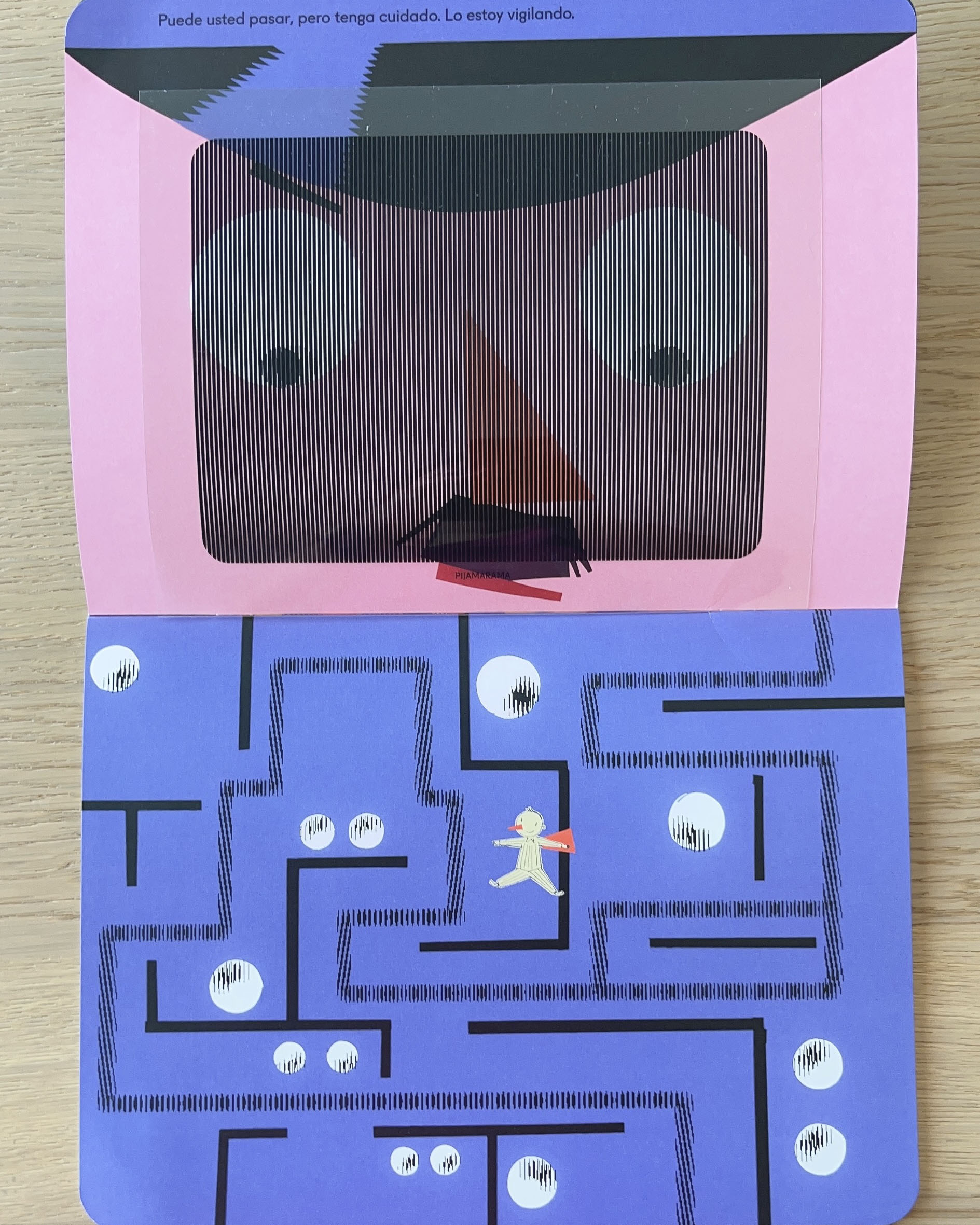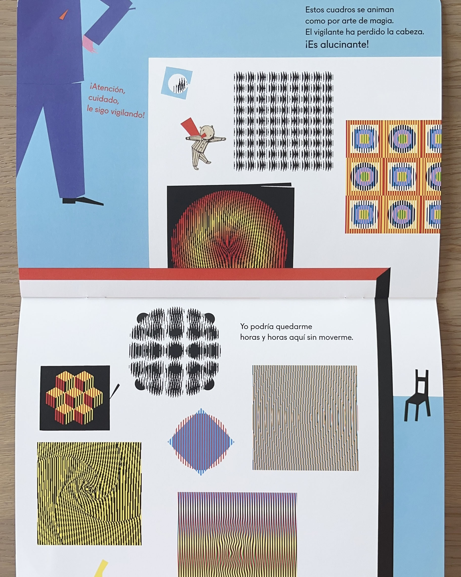 La visita a una exposición de arte se convierte en una gran aventura para el protagonista de “Museo en pijamarama”: bajo la atenta mirada del vigilante, el recorrido por las salas permite su acercamiento a varios estilos modernos, como el impresionismo, el arte abstracto, el arte óptico o la escultura cinética. Miró, Calder o Mondrian son algunos creadores cuyas obras se reconocen en las páginas de este libro. El color y el movimiento son las claves de esta propuesta lúdica e interactiva que muestra el museo como un espacio dinámico y atractivo, lleno de formas y colores que captan la atención del público.