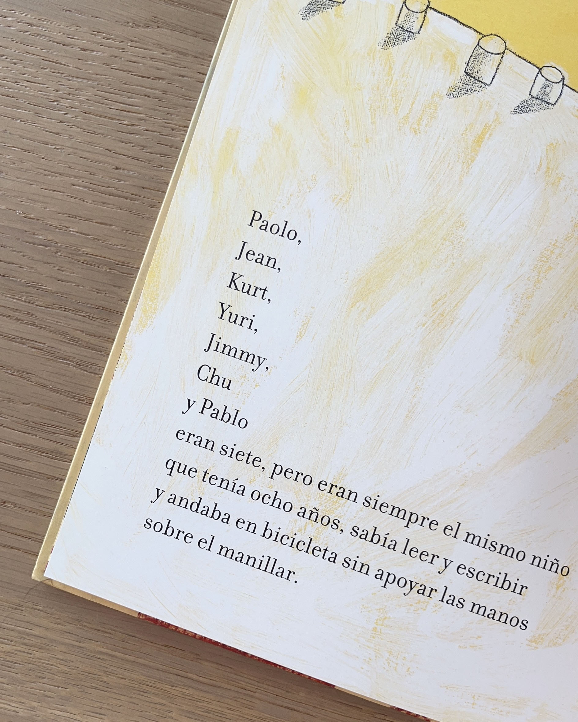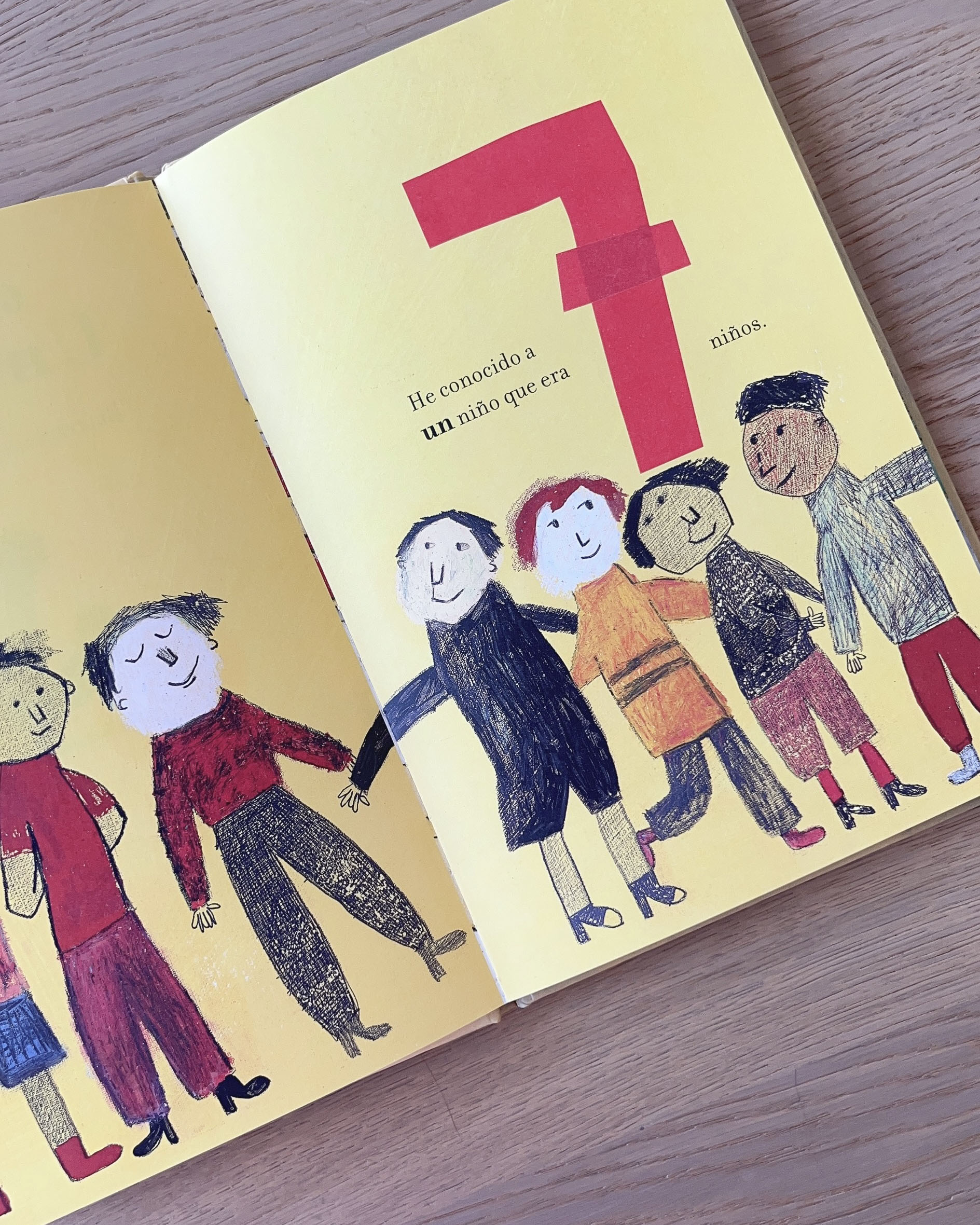 Siete niños diferentes pero que son el mismo niño. Siete niños que ríen en la misma lengua y que, cuando crezcan, no podrán declararse la guerra porque serán el mismo hombre. Beatrice Alemagna ilustra esta historia breve pero con gran significado, con imágenes llenas de texturas y color, que aportan información adicional sobre las ciudades de los protagonistas y en diálogo constante con el texto.